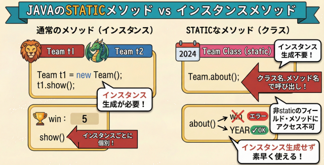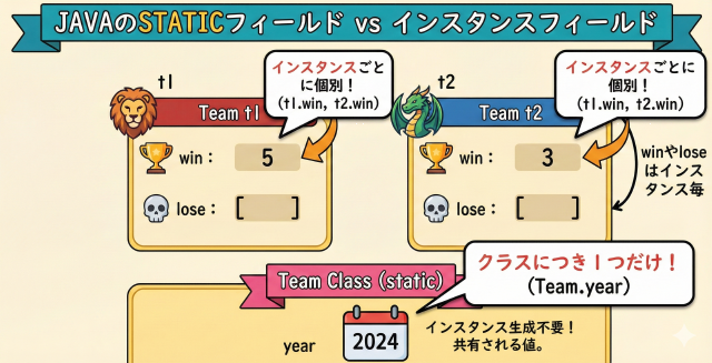 // インスタンス生成 Team t1 = new Team(); Team t2 = new Team(); // インスタンス毎のフィールド t1.win = 5; t2.win = 3; System.out.println(t1.win); System.out.println(t2.win);
