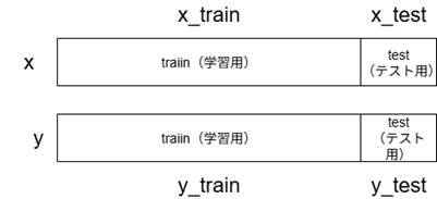 学習用とテスト用のデータに分割を行うためには、DataFrameの行抽出を利用してもよいですが、scikit-learnにはデータを分割してくれる関数 train_test_split があります。これは指定した割合で学習用データ(train)とテストデータ(test)に分割をしてくれるものです。