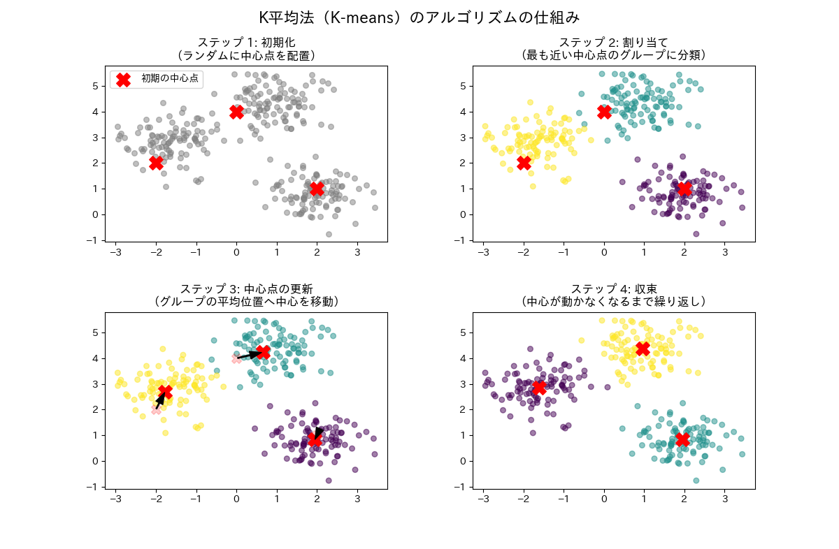 その後、クラスタ内の中心となる点を新たな代表点にします。代表点が変化したので再度全てのデータをどの代表点に属するかを判断します。これを代表点が変化しなくなるまで繰り返します。